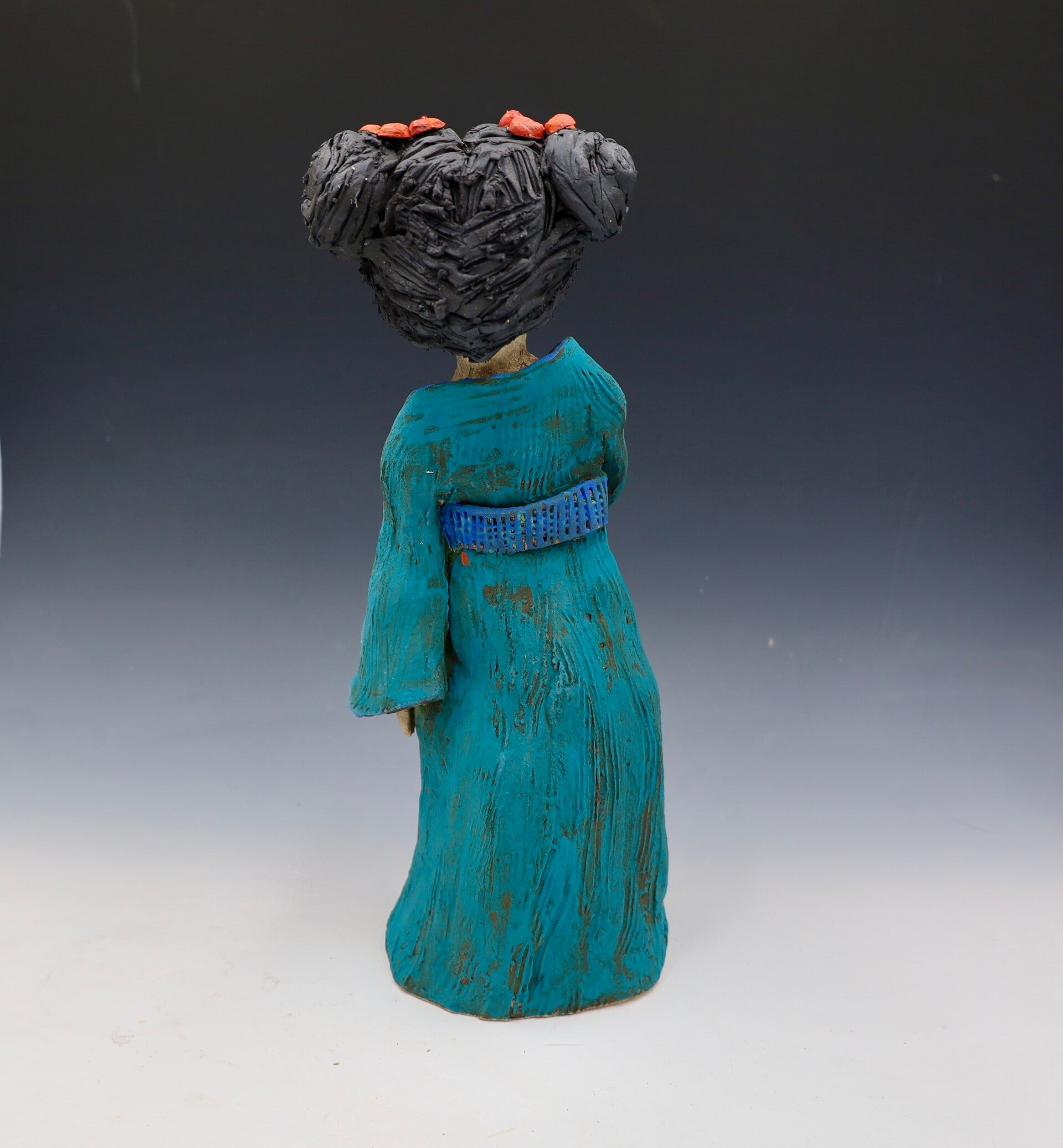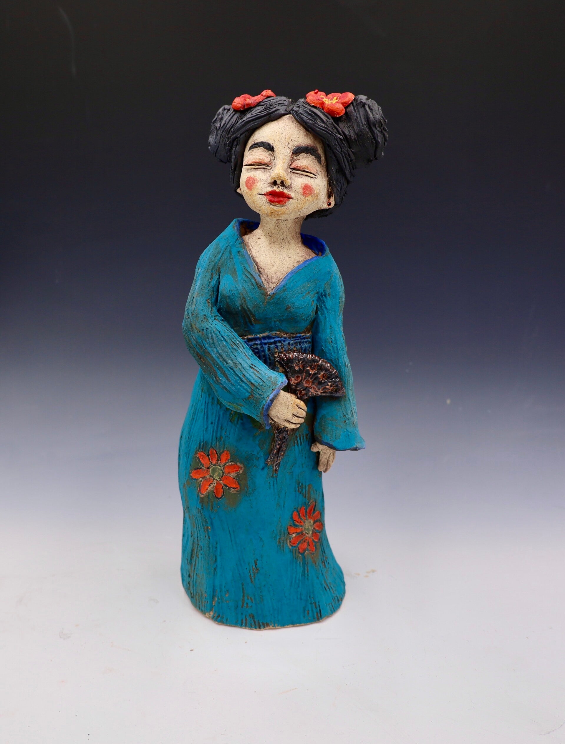 14 inch sculpture, stoneware, underglaze, layered glaze.